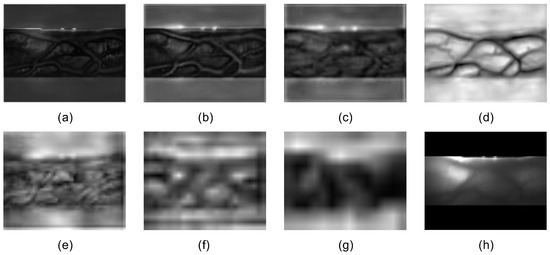 Feature extraction diagram at different levels. (a–c,e–g) are the feature extraction diagrams corresponding to the En_1, En_2, En_3, En_4, En_5, En_6 encoder structures in the HUnet++ model, respectively. (d) is the feature map obtained after the fusion of features extracted by the six-level encoders, and (h) is the original vein image.