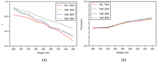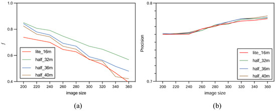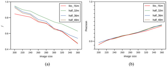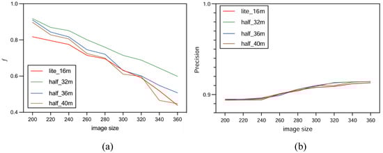 To validate the speed advantage of the proposed model in this paper, we performed training experiments on four models (original model: lite_16m, new model: half_nm) against nine different image sizes, and based on Formula (1), we plotted the line charts of the performance trends of several models as the image size increased.