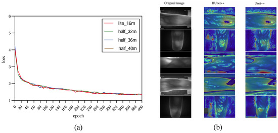 In Figure 7, Figure 8, Figure 9 and Figure 10, in (a), “lite_16m” represents the Unet++ model with 16 hidden layers, “half_32m” represents the HUnet++ model with 32 hidden layers, “half_36m” represents the HUnet++ model with 36 hidden layers, and “half_40m” represents the HUnet++ model with 40 hidden layers. Since nearly half of the original model structure was removed, the initial number of hidden layers in the HUnet++ model was set to twice that of the original model (32 layers) based on our experimental results. Further experiments gradually increased the hidden layer count starting from that baseline.
