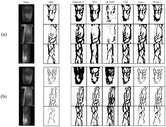 Six models, FCN [33] (the FCN_32s model was utilized here), Deeplab_v3 [29], LR_ASPP (MoblieNet_v3) [34], Unet [35], Unet++, and HUnet++, were trained on the dataset proposed in this paper, and three vein images were randomly selected for vein mask extraction. The extraction results are shown in Figure 12. During the training of the models, FCN, LR_ASPP, Deeplab_v3, and Unet utilized the SGD optimizer, while Unet++ and HUnet++ employed the AdamW optimizer. All models followed the same learning rate adjustment strategy during training, and the binary cross-entropy loss function was used for all models.
