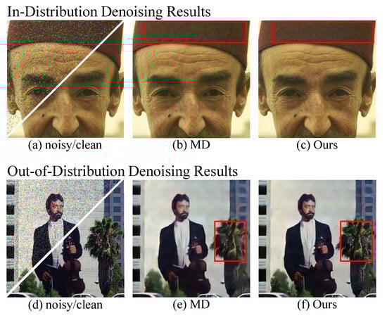 where represents the features of the input noisy image from the network, is the corresponding random mask, ⊙ represents element-wise multiplication, and represents a certain layer in the network. Through this training method, the MD algorithm not only performs well under training noise conditions, but also maintains good denoising performance under different noise conditions [30].
