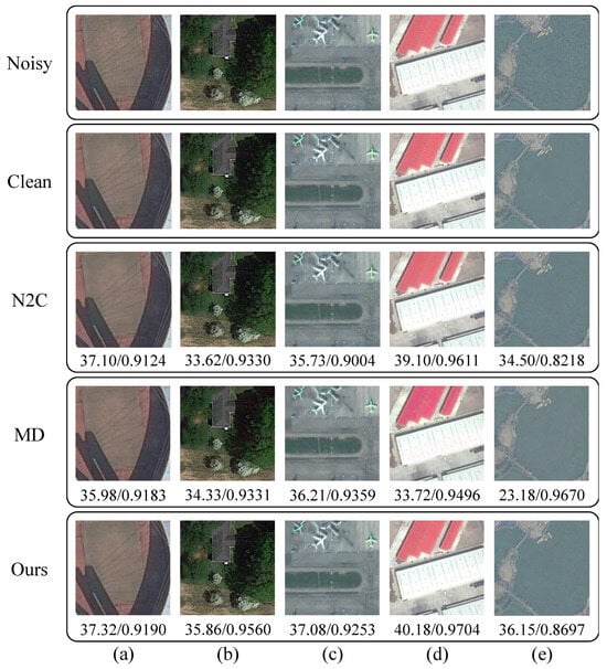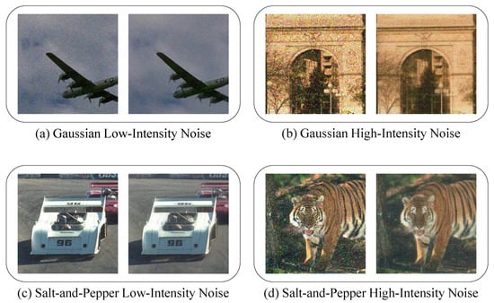 Previous studies have primarily focused on training and evaluating models on images corrupted by Gaussian noise [3,4,5,7,8,9]. These approaches restrict the performance of algorithms to a single noise distribution, and their effectiveness significantly decreases when faced with other types of noise. For models trained on a single intensity of noise, retraining is often required to handle different noise intensities; otherwise, their performance declines significantly, failing to meet the expected denoising effect [11]. Furthermore, in remote sensing, mixed noise distributions require models to handle both diverse noise types and varying intensities.