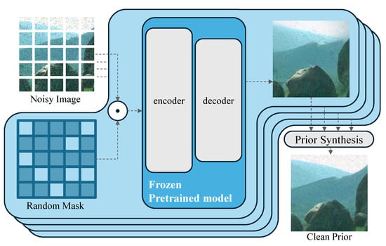 To enhance the effectiveness of image denoising, we utilize the MAE pretrained model, which excels in clean image recovery tasks. Although the MAE [37] does not directly perform image denoising and has not been trained for denoising, our experiments indicate that it possesses inherent denoising capabilities. We aim to leverage this by designing a Prior Block to provide prior information for our denoising method. As shown in Figure 4, our approach involves applying multiple randomly generated masks to the noisy image and inputting it multiple times into the MAE pretrained model [37] to obtain MAE recovery results. These results are then synthesized using Prior Synthesis to form a clean prior image. Our clean prior image maintains the same size and channels as the input, facilitating the generation of pixel-by-pixel corresponding features to the original image dimensions. This integration allows us to effectively incorporate this information into the backbone network for noise removal. Specifically, for each image processed by the pretrained model, we supplement the input image into the output’s non-masked parts, yielding a complete image. Due to the evident grid effects between the generated masked parts and the parts filled with the original image, we perform this operation multiple times on a single image to obtain a smooth result. The formula is as follows: