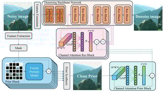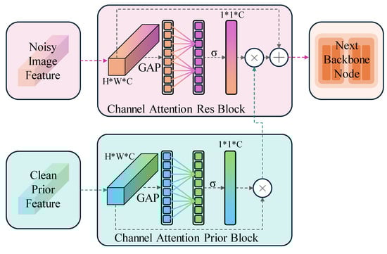 Specifically, as illustrated in Figure 5, we adopt a symmetric channel attention mechanism where one-half of the module processes features derived from the backbone network (supervised by the denoising task), while the other half handles clean image priors produced by a pretrained model in a non-denoising task. Since the prior module has already extracted contextual information around each pixel, channel attention precisely meets our needs. This approach is similar to that seen in the ETLSH-YOLO method [47], where efficient integration of model components ensures edge computing efficiency, enabling superior performance on resource-constrained devices. First, a 1 × 1 convolution layer converts the clean prior image from the MAE [37] (dimension H × W × 3) into a feature map (dimension H × W × C). Then, global average pooling (GAP) compresses the feature map (dimension H × W × C) into a 1 × 1 × C vector. This vector is processed by a 1D convolution-based channel attention mechanism (ECA), where the kernel size is dynamically determined based on the number of input channels. This enables adaptive channel weighting without the need for fully connected layers. The computed attention scores are then passed through a sigmoid activation function to obtain the final channel attention weights.