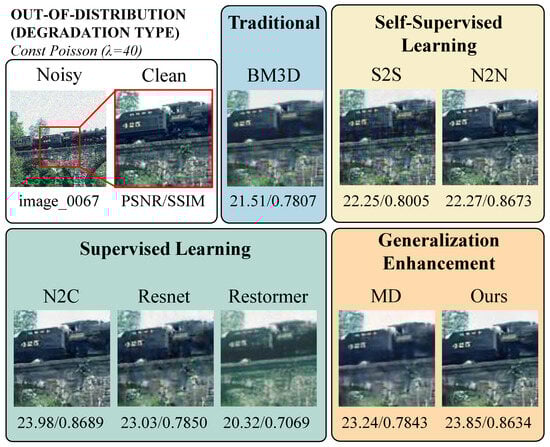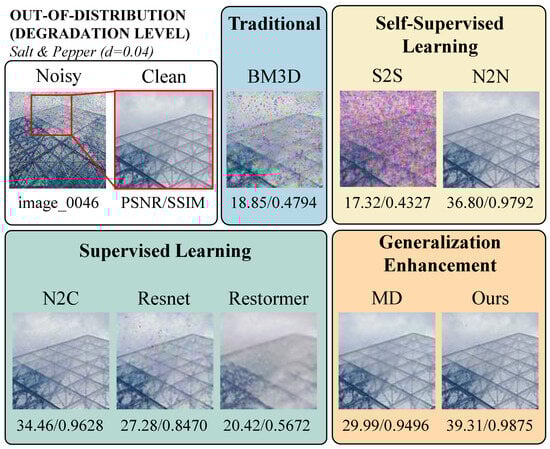 To enhance the generalization capabilities of denoising models, Chen et al. [30] proposed a supervised learning method utilizing mask training, focusing exclusively on Gaussian noise with a variance of 15. While this method demonstrated satisfactory performance on other noise types, its effectiveness diminished under high-intensity noise conditions, as observed in practical tests [30]. To address these limitations, we propose an asymmetric denoising approach that leverages both supervised learning (trained on noisy–clean image pairs) and pretrained models from non-denoising tasks. By integrating the image reconstruction capabilities of models such as MAE [37] with our backbone network, we achieve strong generalization and effective denoising under diverse noise conditions.