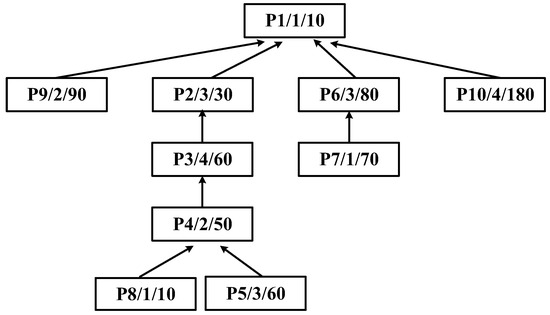 Assume that the complex product P with a tight-front tight-back constraint process is a randomly generated asymmetric structure, as shown in Figure 2; the scheduling process will be described in combination with the algorithm in this paper. However, it should be noted that symmetry is actually a special case of asymmetry. Although this paper takes the product P with an asymmetric structure as an example for analysis, in fact, the algorithm in this paper can show good scheduling results for examples with tree process constraints, whether they are complex products with an asymmetric structure or symmetric structure.