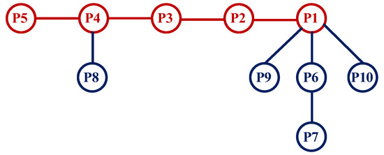 Step 2: As shown in Figure 3, take the process nodes P5, P4, P3, P2 and P1 in the critical path chain as vertices. These processes are marked in red in Figure 3 to establish tightly concatenated sub-strings {P8}, {P9}, {P7, P6}, {P10}, and marked in blue in Figure 3.