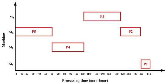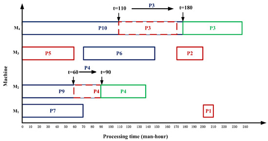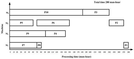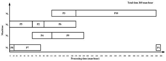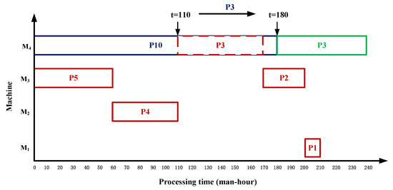 Firstly, {P10} is scheduled: (1) Process P10 is a leaf node process, and there is no tight pre-process constraint. (2) The optimal scheduling time on M4 is t = 0. (3) The processing time of P10 on equipment M4 is , the idle time of M4 from t = 0 is 110 working hours, greater than , so the process, P3, on M4 is moved to t = 180, that is, the optimal scheduling time of P3. (4) Schedule process P10 at t = 0, as shown in Figure 5. Among them, red is used to represent the process on the critical path, blue is used to represent the closely connected sub-string process P10 to be inserted, and green is used to represent the process position after the process is moved backward according to the backward movement strategy.