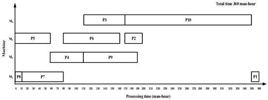CHSO is adopted, with the scheduling strategies layer priority, leaf node priority and short-time priority applied in turn. The scheme of complex product P by CHSO is {P7, P8, P5, P4, P3, P9, P10, P2, P6, P1}, and the makespan is 360 working hours., as shown in Figure 8.