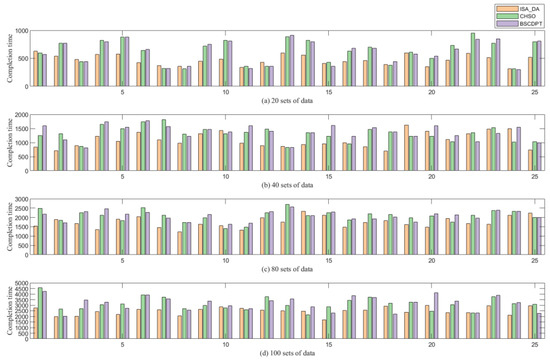 In order to verify the effectiveness of the proposed algorithm, its wide universality and its adaptability to complex products with a symmetric or asymmetric structure, it should have a better scheduling effect than any other algorithm for symmetric or asymmetric complex products with a tree structure. Therefore, the process tree used in the comparative analysis of the algorithm is randomly generated by the computer. In order to verify the optimization of the scheduling effect of the proposed algorithm in this paper, 100 complex product process trees of [20, 40, 80, 100] four kinds of data are randomly selected on four devices in the same computer Matlab R2021b experimental environment; that is, each process tree contains 20, 40, 80 and 100 processes. On average, 25 process trees are selected for each group of data for experiments, and the processing end time of each group of data is compared. Since the number of devices is four, the average number of processing processes per device in the four sets of data are [5, 10, 20, 25] in an ascending order. The scheduling effects of the CHSO algorithm, BSCDPT algorithm and ISA_DA algorithm are shown in Figure 10. In Figure 10, the four subgraphs of a, b, c and d, respectively, show the processing completion time (unit: working hours) of the ISA-DA, CHSO and BSCDPT algorithms when the process tree contains 20, 40, 80 and 100 processing procedures. In order to facilitate the summary, the three algorithms are represented by orange, green and purple in the four subgraphs. As the number of processing operations in the process tree increases, the processing completion time of the algorithm generally shows an increasing trend. In order to more clearly and accurately present the total processing time of each algorithm under different process number conditions, the y-axis of each subgraph is scaled in 500 units.