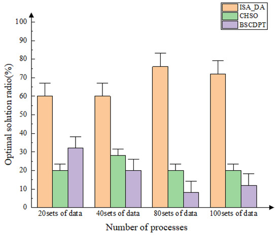 In order to verify the adaptability and superiority of algorithm ISA_DA to different symmetric and asymmetric treelike process complex products, 40 product process trees with different scales and process constraint structures were randomly generated under the same computer Matlab R2021 b experimental environment. The 40 product process trees were divided into four groups; on average, each group contained 10 different process tree instances. The number of processes in these four sets was [20, 40, 80, 100], that is, 10 process trees with 20 processes, 10 process trees with 40 processes, 10 process trees with 80 processes and 10 process trees with 100 processes. The ISA_DA algorithm is compared with the optimal solution ratio of each set of data of the other two groups of the CHSO algorithm and BSCDPT algorithm. This ratio is used to measure the performance of the algorithm. The closer the optimal solution ratio is to 100%, the closer the solution obtained by the algorithm is to the optimal solution, and the better the performance of the algorithm. The experimental results are shown in Figure 11.