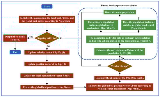 Operation 7: If the H value in the current generation does not change from the previous generation, then implement the fitness landscape-aware evolution. Calculate the correlation coefficient r of the population by Equation (11), based on which of the population is divided into an ordinary subpopulation and an elite subpopulation.