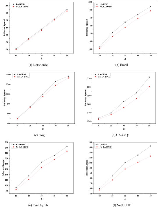 Comparisons of influence spread between LA-DPSO and No_LA-DPSO on the six networks under .