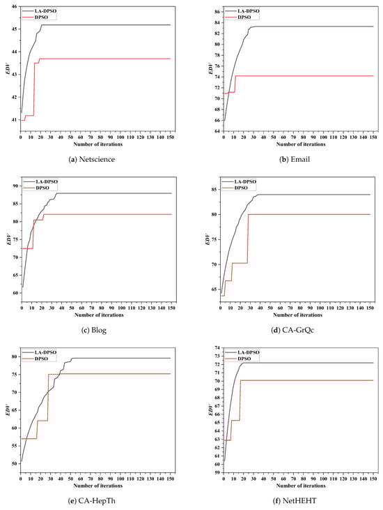 Since both LA-DPSO and DPSO are extensions of the PSO algorithm, we analyze their convergence speed on the six real networks at . Figure 3 compares the convergence speed of LA-DPSO and DPSO on these networks.
