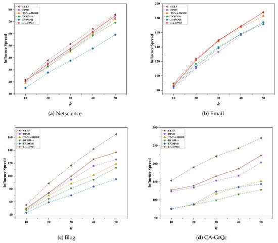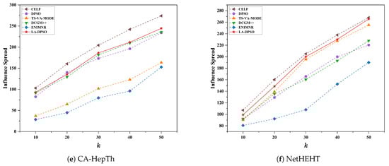 The experimental results show that CELF consistently outperforms other algorithms across all seed set sizes, primarily due to the global optimal guarantee provided by its greedy hill-climbing strategy. The LA-DPSO exhibits superior stability, ranking second only to CELF, particularly in complex solution spaces. This performance stems from its innovative integration of a dynamic population division mechanism based on the fitness landscape, which effectively maintains the population diversity. As evidenced in Figure 4c,d, LA-DPSO demonstrates significant advantages over other algorithms (excluding CELF) in high-density, low-average degree networks, where the entropy metric mechanism prevents the algorithm from being trapped into local optima.