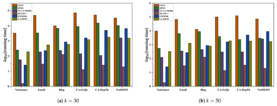 To verify the efficiency of the proposed LA-DPSO on different network types, we compare the running time of the six algorithms under identical conditions. Figure 5 presents the running time of each algorithm on the six real networks at and .
