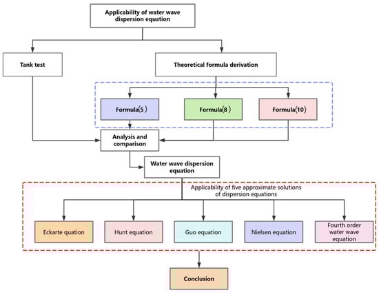 Despite the fact that the dispersion relationship derived from the linear water wave theory is still commonly employed for calculating wavelength in irregular waves under ideal monochromatic wave conditions, its applicability is limited in complex marine environments []. The interplay among water flow, waves, and seabed, along with the nonlinear characteristics of the marine environment, all exert significant influences on wave propagation [,]. These factors are often not fully accounted for in traditional models, which can lead to inaccuracies in real-world scenarios. Therefore, it becomes particularly important to explore wavelength calculation methods under different conditions []. The wave dispersion relationship derived under the assumption of no vortex flow and linear waves has certain applicability, but often faces challenges in practical applications []. For example, existing models struggle to accurately predict wave behavior under varying water depths and current conditions, which limits their real-world utility. To verify whether the linear or nonlinear relationship between frequency and wavelength can be accurately described by the new dispersion relationship equation in actual situations, this paper will measure the actual wavelength and height through experimental measurements and study the applicability and differences of each formula []. In particular, when designing coastal engineering projects in shallow water areas, it is important to use appropriate dispersion relationship formulas [,]. Nevertheless, the conventional iterative approach for resolving the issue is frequently not expedient, as it can be computationally expensive and time consuming. Thus, simplifying the calculation process and obtaining formulas applicable to shallow water, intermediate water, and deep water become pivotal.