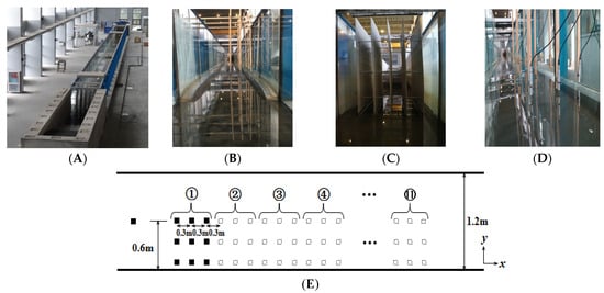 Experimental water tank and test equipment. (A) The panorama of the test water tank layout shows that the length of the water tank is 60 m, the width is 1.2 m, and the height is 1 m; (B) The elevation of the test tank layout shows that the sides are supported by wooden frames; (C) A water wave generator of model WA-9899 with a frequency range of 1–50 HZ; (D) DY300 digital wave height meter; (E) In the schematic diagram of the test water tank layout, 0.6 m represents three rows of wave altimeters, each row is 0.3 m apart, the total width of the three rows is 0.6 m, and 0.3 m is the transverse interval of the wave altimeter. The squares here represent the wave height meter. Numbers 1–11 represent groups of three columns, and a total of 11 groups were measured.