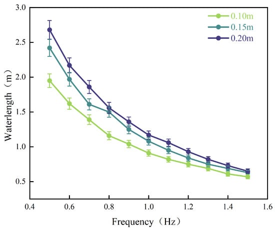 By incorporating the experimental data into Figure 3, a comprehensive analysis of water wave propagation characteristics can be conducted. A distinct trend emerges: as the frequency increases from 0.5 to 1.5, an inverse relationship between frequency and wavelength is observed at water depths of 0.1 m, 0.15 m, and 0.2 m. Specifically, when the water depth is set at 0.1 m, the wavelength decreases from 1.95 m to 0.57 m, resulting in an amplitude reduction of approximately 70.77%. At a water depth of 0.15 m, the wavelength decreases from 2.42 m to 0.63 m, representing a reduction of approximately 73.97%. For a water depth of 0.2 m, it reduces from 2.68 m to 0.65 m, reflecting a decline of approximately 75.75%.