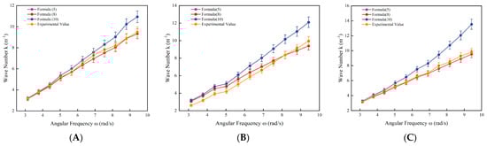 By analyzing the data in Figure 4, we can conclude that there is an intrinsic correlation between the incident frequency of water waves and their wavelength. These charts visually show how theoretical formulas, namely Formulas (5), (8), and (10), compare to actual measurements at different water depths and different frequencies. Under different water depth conditions, the test values and Equations (5) and (8) show highly consistent trends and similar data sizes, especially under short wavelength conditions, the three almost perfectly coincide. With the increase of wave number 3 to 11, the data gap between the corresponding angular frequency of Formula (10) and Formulas (5) and (8) and the actual measured value gradually increases, showing that the degree of dispersion becomes more obvious with the increase of water depth.