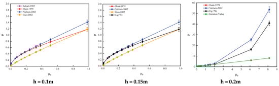 Comparison of experimental data with five direct solution formulas of water depth h = 0.1 m, h = 0.15 m, and h = 0.2 m, respectively.