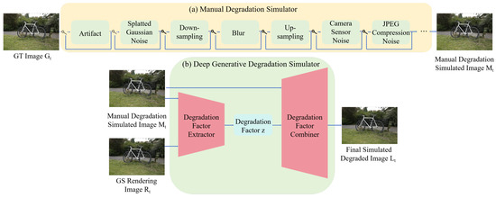 The pipeline of our two-stage degradation simulator consisted of two sequentially stacked simulators: (a) a manual degradation simulator and (b) a deep generative degradation simulator.