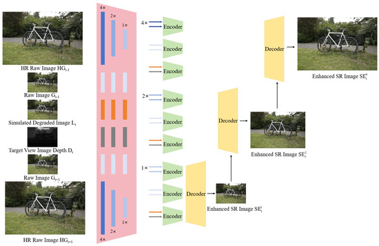 where the functions S, D, and E represent the Super Spatial Information Fusion, Decoder, and Encoder parts, respectively. , , G, L, and D respectively represent the reconstructed enhanced super-resolution image, high-resolution (4K) raw images, low resolution (1K) raw images, the degraded simulated image of the target view, and depth image corresponding to the degraded simulated image. The subscripts t, , and represent the view of the target image and its adjacent views. The superscripts 1, 2, and 4 represent the scale relationship with L. 1 indicates that the scale of is downsampled to same-resolution as L, while 4 indicates that the scale of remains unchanged and is four times the size of L.