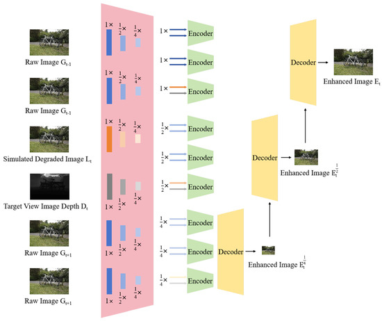 where represents the degraded target frame image obtained through the GS-style degradation simulator, corresponding to the ground truth . and denote the ground truth of the two neighboring views with respect to the target frame, while is the enhanced view of the target frame produced by the view fusion process. The function D is used to simulate the degradation of the ground truth values, while the function V is responsible for fusing multiple frames.