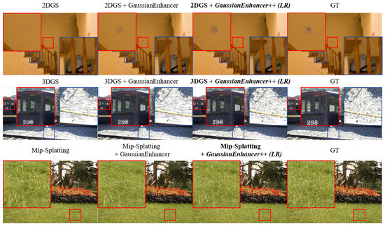 We show the visualization effects of 2DGS, 3DGS, and Mip-Splatting on different datasets with GaussianEnhancer and GaussianEnhancer++. In addition to the enhancement with unchanged resolution, we also demonstrate our enhancement effect on super-resolution. The qualitative results are shown in Figure 5 and Figure 6. It can be observed that our GaussianEnhancer++ network can effectively improve the rendering results of various GS models.