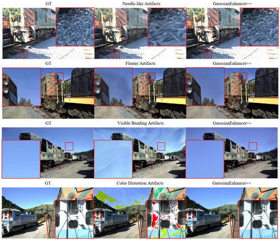 To explicitly demonstrate the remediation of GS-specific artifacts (e.g., needle-like artifacts, visible banding artifacts), Figure 7 presents a comparison using degraded images from the Train scene. The selected examples highlight raw GS-rendered outputs with pronounced artifacts alongside their enhanced counterparts processed by GaussianEnhancer++. Our method effectively suppresses structural distortions and recovers fine details.