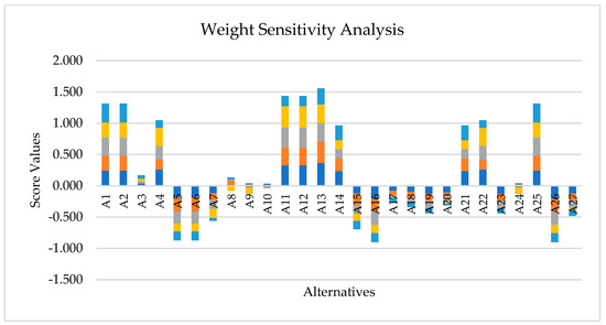 The PF-COCOFISO method’s effectiveness for digital media and intangible-heritage digitalization was measured by testing numerous weight modification scenarios. Figure 4 illustrates the weight sensitivity analysis, where the criteria weights are modified five times to evaluate the stability of rankings for twenty-seven alternatives. Each color in the bars represents the impact of different criteria under these weight variations. The results demonstrate that the method retains stable ranking orders, which especially applies to the high-positioned alternatives and . Reliable decision-making results were obtained due to the method’s stability, which minimizes ranking variations due to slight expert weight modifications. The model shows high credibility because weight adjustments have no effect on the consistently low rankings of , , , and . The ranking adjustments of the mid-ranked alternatives , and mainly correspond to specific criterion variations rather than instability factors. The model benefits heritage digitalization projects because the PF-COCOFISO method avoids artificial ranking changes through its sensitivity control mechanism.