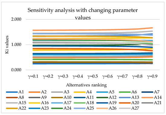 The PF-COCOFISO methodology proves its capability as a robust decision tool during digital media and intangible-heritage digitalization through sensitivity parameter analysis that tests various values of from to , as shown in Figure 5. The rankings of the , and alternatives stay optimal as they consistently hold leadership positions in every parameter variation. The least successful alternatives among the analyzed alternatives demonstrate negative values in all weight variation scenarios. The specifications in the criteria adjustments lead to moderate ranking changes for the alternatives , and . The PF-COCOFISO method demonstrates reliable and stable ranking results through different parameter scenarios, thus establishing itself as a solid choice for strategic decision-making processes related to intangible-heritage preservation using digital approaches.