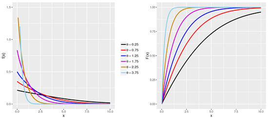 The Pdf and Cdf plots for the iXgamma distribution with different values of are shown in Figure 2. These plots exhibit characteristics similar to those of the exponential distribution.