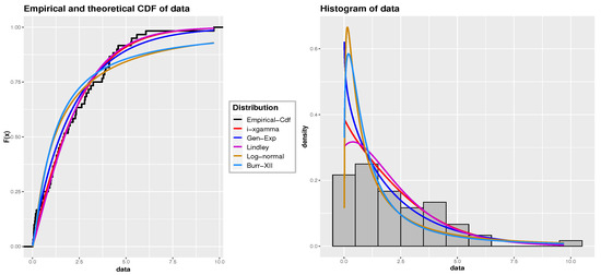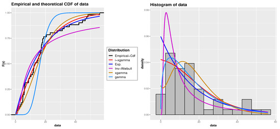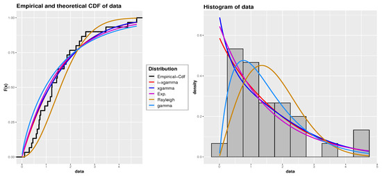 Following a methodology similar to the first and second applications, we assess the compatibility of the iXgamma distribution both numerically and graphically with this dataset. We compare its fit with the Gamma, Rayleigh, exponential, and Xgamma distributions. The estimated parameters and GOF statistics can be found in Table 14. Figure 7 displays the empirical Cdf and histogram with the fitted Cdf and Pdf lines for the various distributions. The results suggest that the iXgamma distribution offers a better fit than the other distributions for this particular dataset.