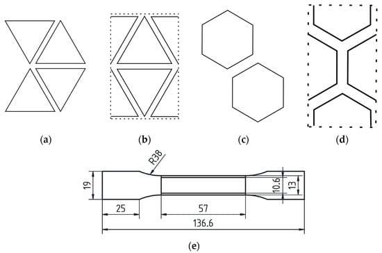 Figure 7 shows the PLA specimens after the tensile test. It can be seen that fractures generally occurred along the edges of the infill shapes that were perpendicular or the closest to being perpendicular to the applied force direction. This occurrence indicates weak points in the printed structures and is especially visible for the shapes with rotational symmetry orders of 3 and 4 (Figure 7a,b). A higher order of rotational symmetry (i.e., 6, visible in Figure 7c) did not display the same behaviour to such an extent.