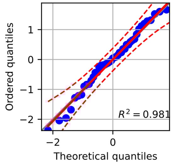 To test whether the infill’s geometric shapes with different orders of rotational symmetry and their angles of rotation affect tensile strength, the means of the maximum force were compared between the nine groups. To compare means between groups, an Analysis of Variance (ANOVA) is the first choice provided the data satisfy its assumptions. An ANOVA assumes that data within groups are distributed normally and variances between groups are equal, and it assumes the independence and random sampling of data within groups. While there exist analytical tests for the normality of data, graphical methods are increasingly used since the results of analytical tests are strongly affected by the sample size. The standard tool used to assess data normality is a quantile–quantile (Q-Q) plot. Small sample sizes limit the ability to test the normality of data within groups. In such cases, the normality of residuals is tested. A Q-Q plot of residuals for the maximum force is displayed in Figure 3. The plot reveals that the data can be considered normally distributed since the points closely follow a straight line and are contained within the 95% confidence interval marked with two dashed lines. The blue points represent the quantiles of the observed residuals vs. the theoretical quantiles of the normal distribution. The red line’s slope and intercept are calculated from first and third quartiles of both the observed and theoretical distributions. The dashed lines represent the 95% confidence interval around the red line.