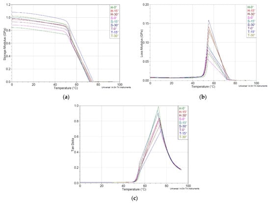 PLA is an amorphous or semi-crystalline material with a glass transition temperature (Tg) above room temperature. The shape of the storage modulus curves (E′) of all samples shown in Figure 4a indicates its semi-crystalline structure [54,55]. Three significant regions are clearly visible in each specimen, namely glassy, glass transition, and viscous. In the glassy region (between 0 and 50 °C), the storage modulus of the PLA polymer is high and constant with a small temperature dependence due to the restricted chain mobility in the PLA structure (the material is stiff). However, as soon as the temperature rises above the Tg value, the storage modulus decreases significantly due to the increase in molecular motion in the polymer, which is influenced by the rising temperature and the input oscillation during the test: PLA becomes softer and more flexible; it loses its stiffness [56]. The transition temperature is between 50 and 75 °C, and the viscous region is above 75 °C with the minimum storage modulus, regardless of the infill pattern and the rotation angles of the observed specimens.