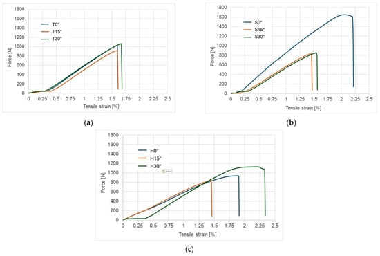As can be seen from the results, the test specimens with triangle geometric shapes (Figure 6a) showed the lowest distribution of results depending on the angles of the infill pattern compared with the other printed shapes (square and hexagon). For these specimens, the application of a force between 850 N and 1050 N led to a relative elongation of the specimens of 1.712% to 2%, regardless of the angle of rotation of the specimen. A small increase was observed at a pattern angle of 30° (T-30°) compared with the other samples printed with the triangle shape (T-0° and T-30°). In the case of the test specimens filled with a square shape (Figure 6b), a significant deviation in the results can be seen with regard to the decrease in percentage elongation when force is applied. The square patterns printed with a pattern angle of 15° and 30° had significantly lower values than the specimens with an infill angle of 0°. For the specimens with a hexagonal pattern (Figure 6c), it can be seen that a pattern angle of 15° had a lower elongation (~1.5%) than the 0° angle (~1.9%), and the highest elongation was observed when using the infill pattern with an angle of 30° (~2.35%). In general, the results show that the highest tensile strains occur with the S-0° specimens at a force of ~1650 N and with the H-30° specimens at a force of ~1150 N. The results also indicate that the shape with an order of rotational symmetry of 3 is the most resistant to rotation in regard to changes in tensile properties.