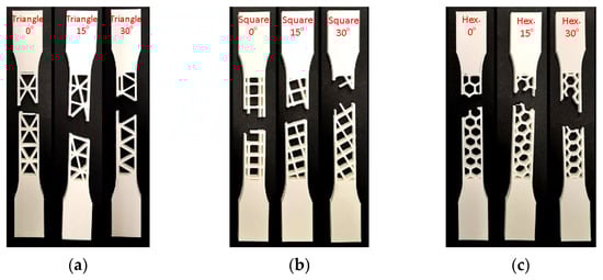 Fracture locations for tested 3D-printed PLA specimens: (a) equilateral triangle, (b) square, and (c) regular hexagon with infill pattern angles of 0°, 15°, and 30°.