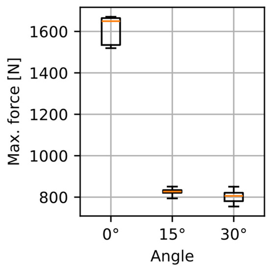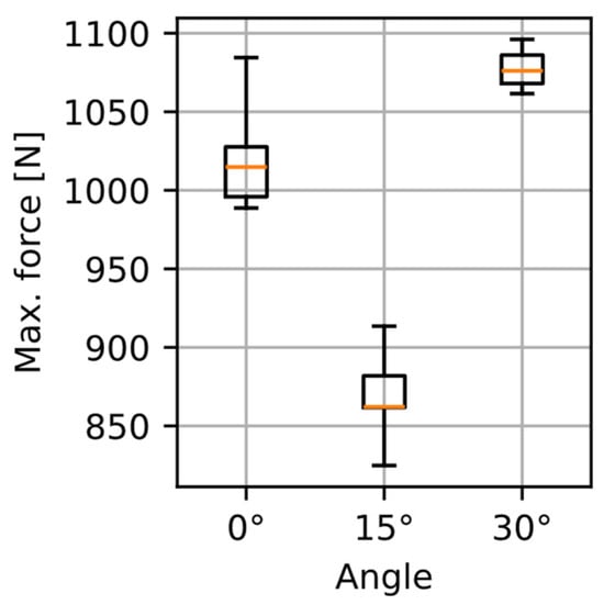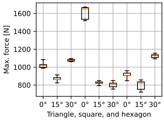 The boxplots for all shapes and angles are displayed in Figure 11. The three leftmost boxplots show the distributions of the maximum force for different angles of the triangle-shaped infill. The middle three show the same kind of results for the square-shaped infill and the rightmost three for the hexagonal-shaped infill.