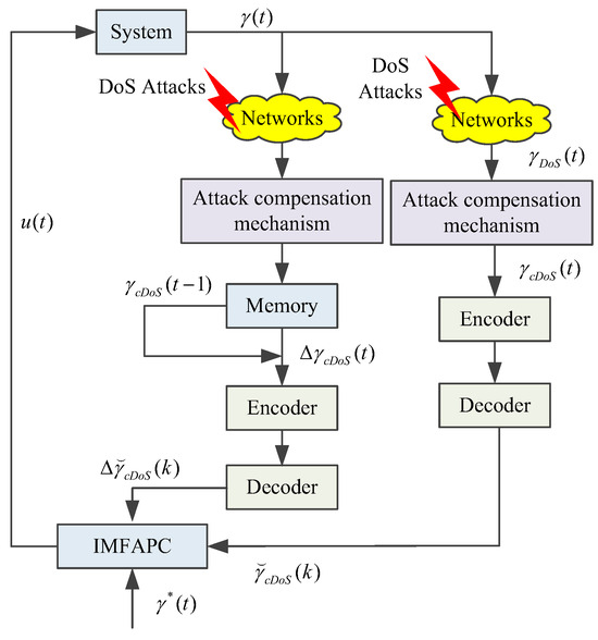 Figure 1 is a block diagram of the control system under a DoS attack that uses the proposed IMFAPC method. According to Figure 1, firstly, the network attack occurs at the output of the system, and the system output data after the attack are processed by the attack compensation mechanism. Secondly, a uniform quantizer with an encoding and decoding mechanism is given to deal with the network bandwidth limitation and to reduce the effects of quantization errors. Finally, based on the quantized output data, the designed IMFAPC method is applied to the system.