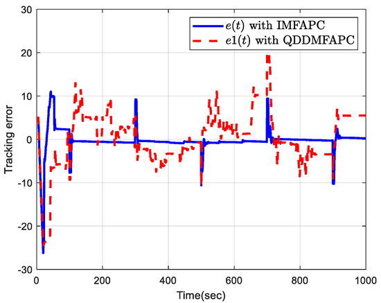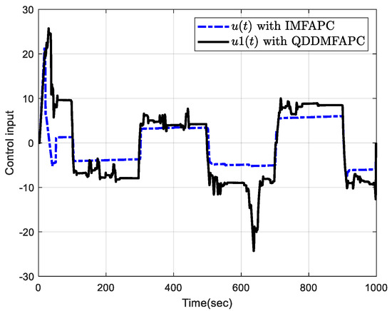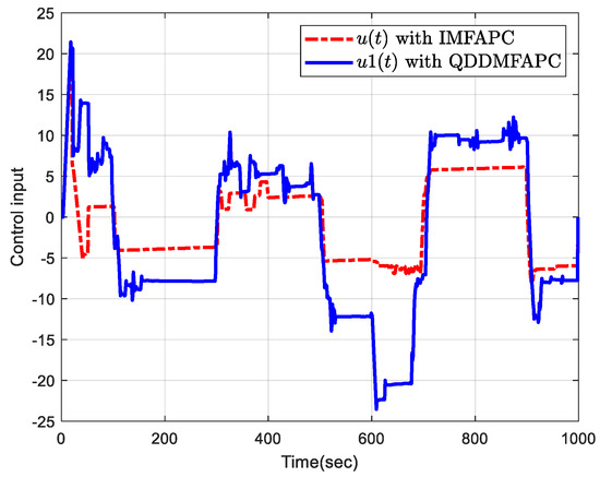 Figure 3 plots the output tracking profiles of the system output and . Figure 4 is the control input profile. Figure 5 plots the tracking error of the system output and . It can be seen from Figure 3 and Figure 5 that the presented IMFAPC algorithm has better control performance under DoS attacks than the QDDMFAPC method.