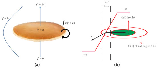 where represents the jump in the field across the chiral bag. At the “magic angle” , the energy level crosses zero, requiring a redefinition of the vacuum. This redefinition implies that the baryon charge Q fractionalizes into three parts, each carried by the Hall droplet, the chiral bag, and the exterior of the bag [60,78,90]