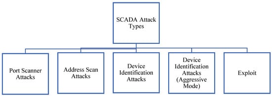 The collaboration with the web enables SCADA systems to operate even in remote locations. However, this convenience also brings along cyberattacks. The modernization of SCADA systems, the standardization of communication protocols, and increased interdevice communication have resulted in an increase in cyberattacks. Successful attacks on SCADA systems can lead to financial losses, environmental pollution, the loss of human lives, and more. Various measures are being developed to prevent cyberattacks. To develop these methods, there is a need for real or test environment examples of network attack data. Different types of attacks are carried out in SCADA systems at various dimensions and layers. In this study, five different types of attacks were conducted at the network level, including port-scanning, address-scanning, device identification (aggressive mode), and exploit attacks. The performed attacks are shown in Figure 3.
