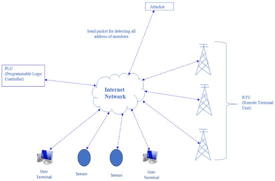 In Figure 6, as observed, the attacker sends specialized packets from either the internet or within the system through any open endpoint to the internal network, aiming to identify the addresses of devices, such as ID, MAC, and IP addresses. As depicted in Figure 6, the attacker sends specific network packets to devices such as routers and switches from within the system or over the internet, collecting information about the system’s main and end components, including RTUs, sensors, users, and the Master Terminal Unit (MTU).