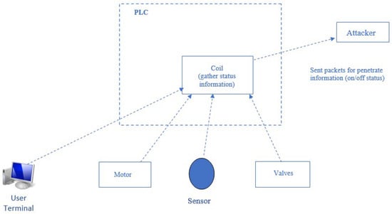 As shown in Figure 7, the ON/OFF status information of member devices, such as computers, motors, sensors, and valves, is sent to the coil. The attacker gains access to the information of these member devices by directly connecting to the coil or through the PLC. This is achieved using customized packets, such as network packets.