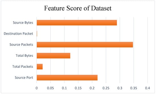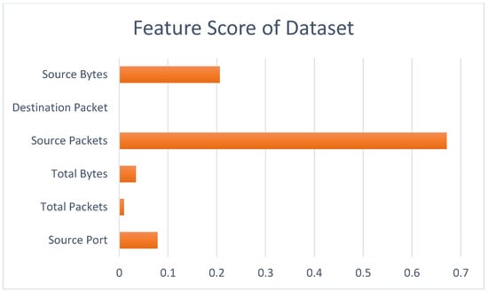 Table 5 displays the detailed numerical results of the feature score values. According to the table, the Source Packets feature has the highest feature score value, indicating its strong impact on the outcome. The feature score values of the other features are also presented, allowing for a comprehensive comparison of their importance rankings in the classification process.
