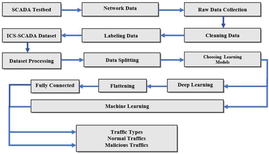 IoT systems are used in various fields, including the industrial and manufacturing sectors. Initially designed to collect and transmit data from devices, the Internet of Things (IoT) has become a widespread connection method in different application areas. However, the increasing popularity of the IoT has brought significant constraints and challenges in terms of privacy and security, allowing access to sensitive data due to weak protocols, unaware use of IoT devices, and limited security guidelines [1]. While industrial automation and control applications traditionally operate in closed systems, the need for increased connectivity and access to higher computational resources has led to the adoption of the IoT in these domains, referred to as the Industrial IoT (IIoT) [2]. The IIoT connects smart and embedded objects to cloud computing platforms, enabling real-time, intelligent, and autonomous access, analysis, and communication and the exchange of process, product, and service information in industrial environments [3]. In particular, with the emergence of Industry 4.0, the use of IIoT systems in the industrial sector has been rapidly increasing. IIoT applications can be found in areas such as smart factories and energy production systems, including smart grids [4]. They are widely preferred in large-scale organizations due to their performance and ease of use. Supervisory Control and Data Acquisition (SCADA) systems collect data from remote sensors and industrial equipment and transmit them to a central station [5]. The IIoT plays a vital role in these systems, which are extensively used in critical infrastructure sectors, such as the energy, oil, metallurgy, natural gas, railway, water supply, and chemical industries [6]. Interconnected critical infrastructures provide essential materials and services for national security and economic operations. However, with the rise of Industry 4.0, Smart Manufacturing 2025, and the IIoT, hacker attacks have begun to target critical infrastructure [7]. SCADA system security poses a new challenge in the field of IIoT risk assessment. SCADA, which runs about 80% of the services in the United States, is responsible for controlling smart grids [8]. Like the intricate dance of symmetrical patterns, the quest for cyberattack detection within SCADA systems, nestled in the vast landscape of the IIoT, mirrors the harmonious pursuit of balance and order amidst the complexities of big data environments. North America and Asia are the regions most affected by severe cyberattacks, with the largest data losses occurring in North America [9]. A recent study conducted at MIT developed a data-driven prioritization scoring scheme for SCADA attacks [10]. SCADA systems use telecommunication or third-party networks. They operate based on event-driven data transmission as the detected values change. SCADA systems require a Human–Machine Interface (HMI) for control. Because they operate on commercial Windows PCs, they are susceptible to operating-system and Windows-based attacks. Connecting SCADA-based IIoT systems to IT networks increases the risk of backdoor attacks with TCP/IP-based methods [11]. These systems, which facilitate daily life and have become widespread in many fields, also attract the attention of cyberattackers. Vulnerabilities in the systems can be identified and exploited for attacks. If the necessary cybersecurity measures are not taken by 2030, it is estimated that the cost of cyberthreats to IIoT and IoT systems will reach USD 90 trillion [12]. Cyberattackers exploit these valuable targets by attempting new attacks every day. The integration of modern technologies like the IoT and IIoT into SCADA systems has increased their vulnerability to security breaches. In the event of an attack, it is crucial to carry out an in-depth forensic analysis to pinpoint the exact cause and identify the perpetrators. However, the unique, dynamic nature and specific resource requirements of SCADA systems challenge traditional IT forensic methods in effectively identifying and categorizing these security incidents. Therefore, implementing a robust digital forensic incident response (DFIR) strategy is vital for safeguarding SCADA systems against cyberthreats [13]. In response, defense mechanisms need to be developed, and precautionary measures need to be taken. Continuous updates of security measures are essential for ensuring cybersecurity. Therefore, in an environment in which traditional methods no longer effectively stop attackers, new models and approaches are being developed. In recent years, machine learning and deep learning models have been frequently used, especially in the field of cybersecurity, and particularly for attack detection [14]. These models are commonly preferred in intrusion detection systems (IDSs) in the cybersecurity field. Unlike traditional methods, machine learning and deep learning models offer high detection accuracies and low error rates. This makes them suitable for various IDSs. To facilitate learning, the models need to analyze the dataset with predefined models. Therefore, the importance of data is evident in this field as well. Especially for deep learning models, a large volume of data is required for effective learning. It is estimated that the digital data generated will reach 175 zettabytes by 2025. The size of the data is crucial for more detailed and accurate learning [15]. However, to process data in machine learning and deep learning models, the data need to be prepared for use. The raw data obtained from the system undergo preprocessing steps to make them ready for analysis with the models. Once the data are prepared, learning is performed by analyzing them with the models. After completing the learning process, the models can detect attacks in IDSs. The data examined in this study consist of network data related to SCADA systems. The dataset includes normal network traffic and attack network traffic. The dataset was ana