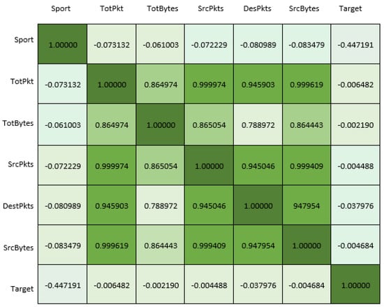 In Figure 11, the relationships between the seven features in the WUSTL-2018-IIoT dataset were examined. A Pearson correlation matrix (PCM) was used to obtain Figure 10, which provides the degrees of the relationships between the features. In these relationships, a value of +1 represents the highest correlation, while −1 represents the lowest correlation. Looking at the diagonal axis in Figure 10, the same features intersect on this axis, so the correlation values have the highest value of 1. The correlation values are distributed in the range from +1 to −1. The colors of the correlation values are shown in shades ranging from dark green to white. A correlation value of 1 is represented by the dark-green color, while a correlation value of −1 is represented by the white color. After analyzing the feature relationships, the dataset was examined using machine learning, deep learning, and hybrid learning models, and the results are shown in the column chart in Figure 12.