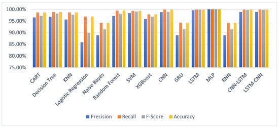 In Figure 12, the percentage results of the precision, recall, F-score, and accuracy parameters for the examined dataset using the CART, Logistic Regression, Naive Bayes, Decision Tree, Random Forest, SVM, XGBoost, KNN machine learning, CNN, LSTM, GRU, MLP, RNN deep learning, and LSTM-CNN and CNN-LSTM hybrid models are presented in a column chart format. When analyzing the results of the deep learning models, higher accuracy rates, as mentioned in the literature, were achieved. The percentage results of the machine learning models are lower compared to those of the deep learning models. The dataset under study is more suitable for models based on binary classification. In the class column of the dataset, normal traffic is represented by the number 0, while attack traffic is represented by the number 1. Therefore, it is more suitable for binary classification, as it consists of two types of class values. In the literature, the most used models for binary classification can be listed as the Logistic Regression, Decision Tree, Random Forest, and Support Vector Machine models. In our study, the results are shared using the mentioned models along with other models. Although high results were achieved with models suitable for binary classification, the highest result was obtained in the MLP model. The reason for this is that, although the dataset class consists of 0–1, it is observed that there are different attacks when looking at the content of the attack traffic. This is due to different types of attack traffic having different feature values. As a result, the dataset becomes more complex, and models like Logistic Regression and Decision Tree become somewhat insufficient in classification. Therefore, more complex models should be preferred for these complex types of data, just as in our study. Hence, while analyzing the dataset, not only binary classification models but also different machine learning and deep learning models were preferred. Thus, higher results were obtained in the MLP model. The detailed numerical values of the results are provided in Table 7.